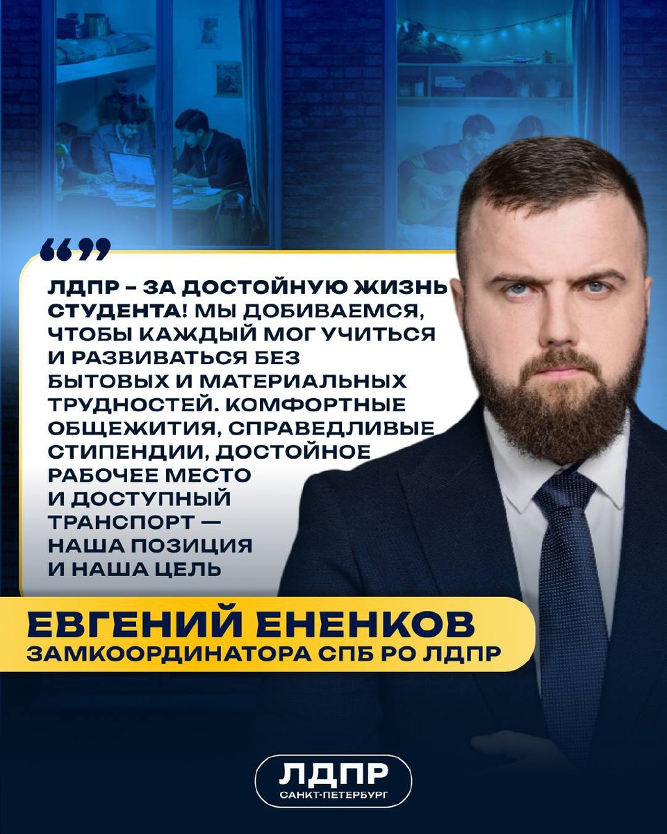 ЛДПР - ЗА ДОСТОЙНУЮ ЖИЗНЬ СТУДЕНТА! Я регулярно общаюсь со студентами. И продолжаю слышать о переполненных общежитиях, старых корпусах, слабом интернете и неподъемных ценах. Так не выглядит инвестиция в будущее. ЛДПР говорит прямо: поддержка студенчества - это не разовые акции и красивые отчёты. Это системная государственная политика. • Единый стандарт студенческих общежитий. Нормальная плотность проживания, современные условия, стабильный интернет. Государственные вузы содержатся за счёт налогов - значит, инфраструктура должна работать в интересах российских студентов. • Единый льготный статус студента по всей стране. Чтобы студент в Петербурге, Пскове или Владивостоке имел равные права: льготы на транспорт, культуру, спорт, городские пространства. • Полноценные кампусы, а не «койко-место». Кампус - это среда для жизни, науки и развития. Современные студенческие пространства должны появляться во всех регионах. Депутат ЕНЕНКОВ. Подписаться.