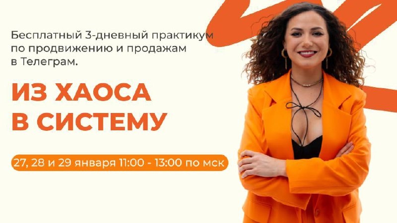➡️ Присоединяйся к самому масштабному открытому 3-х дневному практикуму "ИЗ ХАОСА В СИСТЕМУ" о том, как выстроить систему продаж и привлечения клиентов из Телеграм🥳 Как вести ТГ канал, чтобы с него были клиенты и продажи? Для сильных и опытных экспертов, которые уже продают свои услуги и продукты, имеют клиентов по сарафану, но хотят масштабироваться и выйти на доход 300-500-700 тыс руб. 🟠без продюссеров и большой команды 🟠без бесплатных диагностик (если вы от них уже выгорели) 🟠без спама и бесящих рассылок в личку При этом: 🟠не впахивать, как лошадь 🟠никого не уговаривать зайти в работу 🟠успевать жить свою жизнь: семья, спорт, путешествия Практикум пройдет 27, 28 и 29 января с 11:00 до 13:00 мск здесь Никакой доп. регистрации не требуется, но требуется твое живое и активное участие в эфирах, чтобы исправить то, что не работает сейчас. 🟧На практикуме ты получишь не воду и не сухую теорию, а разбор СИСТЕМЫ и целевых действий, чтобы привлекать своих идеальных клиентов. Что