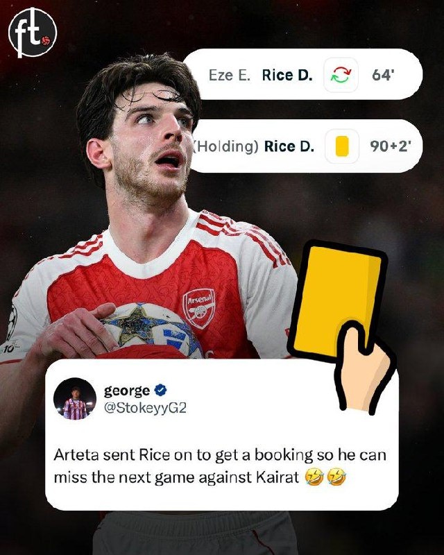 Деклан Райс вчера умно получил желтую карточку и теперь будет дисквалифицирован на матч "Арсенала" с "Кайратом" на следующей неделе 🧠