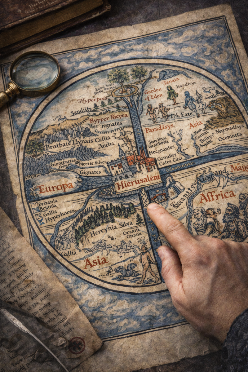 До начала активных контактов география была для европейцев не столько наукой о земле, сколько инструментом эсхатологии — ожидания конца света. Карты строились согласно библейскому стиху: «Сей Иерусалим, посреди языков положих его» (Иез. 5:5), где восток находился вверху, а река Танаис (Дон) отделяла Европу от Азии.