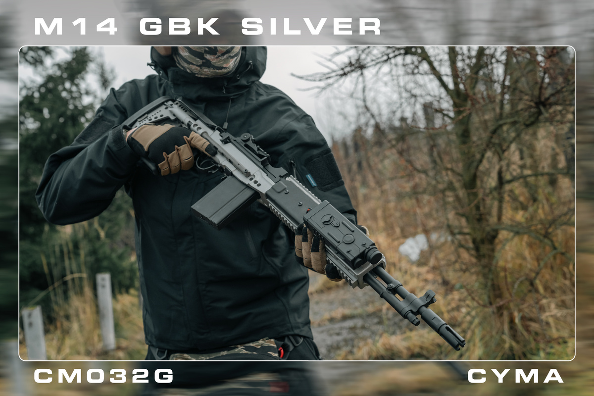 Если обычная «эмка» кажется вам скучной попсой, а классическая M14 — слишком винтажной, у нас есть решение. Встречайте — Cyma M14 GBK (CM032G) в эффектном серебристом исполнении. Это не просто винтовка, это настоящий вызов стандартам. По сути, перед нами кастомная вариация MK14 EBR. Кстати, боевого аналога именно в таком виде мы не нашли (если вы знаете, существует ли он в реальности — напишите в комментариях, нам правда интересно!). Необычная конструкция Главное отличие версии GBK — приклад на рельсах. Из-за этого проводку пришлось вывести вперед, в цевье (у классической EBR она прячется в трубе приклада). Решение с аккумулятором