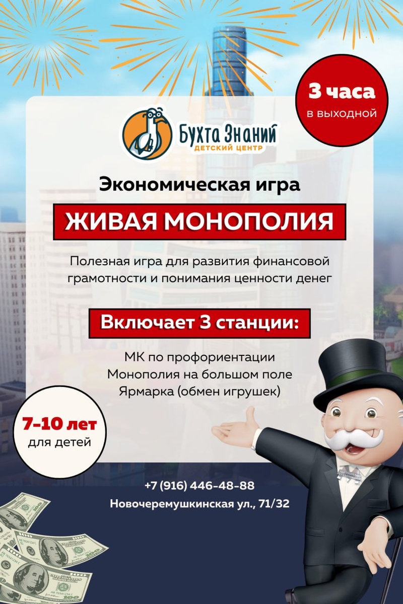 Живая Монополия для детей! 💸 31 января в субботу с 14:00 до 17:00 далее 15 февраля в воскресенье с 11:00 до 14:00 Развиваем финансовую грамотность, профориентацию и самостоятельность через игру! Хотите, чтобы ваш ребёнок провёл выходной весело и с пользой, научился обращаться с деньгами и попробовал разные профессии? Приглашаем на 3-часовую живую экономическую игру, где каждый ребёнок станет героем собственного приключения в мире денег и профессий! 🎲 Что ждёт детей: • Огромное живое поле 3×3 метра с гигантскими кубиками и карточками – настоящая Монополия в реальной жизни! • Командные игры с заработком вампумов – мини-валюты для покупки и продажи игрушек на ярмарке. Деньги остаются у ребёнка и действуют на всех играх в клубе и на сменах! • Увлекательные мастер-классы по профессиям: физик, химик, скульптор, художник, врач, инженер и другие – ребёнок попробует себя в разных ролях. • Изучаем Москву через игру – покупаем знаменитые объекты города, например, Шоколадную фабрику. • Игра б