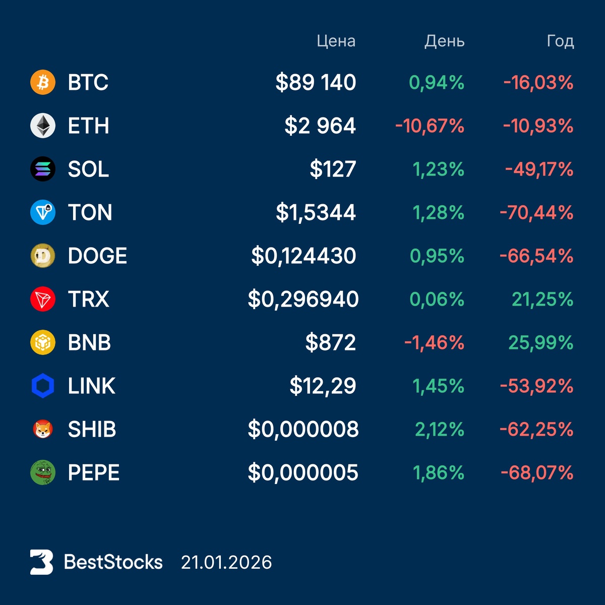 Курсы основных криптовалют: Bitcoin, Etherium, Solana, Toncoin, Dogecoin, TRON, BNB, Chainlink, Pepe, Shiba Inu на текущий момент