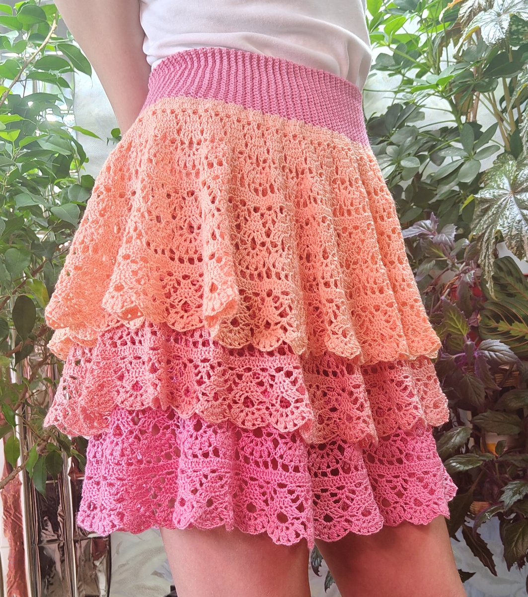 Стандартный детский размер на рост 154. Но так как юбка на резинке, вполне подойдет на более крупный размер. Длинна готового изделия - 41 см. Начинаем работу с резинки. Она вяжется попрёк полотна. Набираем цепочку длинной 6 см и вяжем резинкой из столбиков без накида. У нас должна получиться полоска длинной 60 см в стянутом состоянии. В растянутом должна быть не менее обхвата бедер. Если вы выберете другой способ вязания резинки, учтите этот момент. Замыкаем полученную полоску в кольцо и связываем. Далее будем продолжать работу по кругу. Первый ряд набираем по краю провязывая столбики с накидом следующим образом. Если приглядеться в краю резинки, между ребрами можно заметить 2 дырочки, куда прямо напрашивается провязать петлю. Для первого ряда в каждую такую дырочку провязываем по 2 столбика с накидом. Далее нужно пересчитать получившиеся петли. Рапорт нашего дальнейшего узора - 8п. То есть количество петель должно быть кратно 8. Если же количество не совпадает, в следующем ряду надо