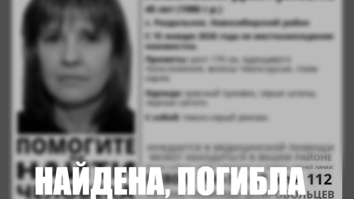 Жительница села Раздольного пропала 15 января. Пять дней её пытались отыскать близкие. Об этом сообщили в группе регионального отряда «ЛизаАлерт» в VK. Отмечается, что поиски сибирячки начались сразу после публикации информации о её пропаже. 20 января обнаружили её тело. «Найдена. Погибла», — такое сообщение опубликовали волонтёры. Подробности о местонахождении тела и причинах смерти не разглашаются.