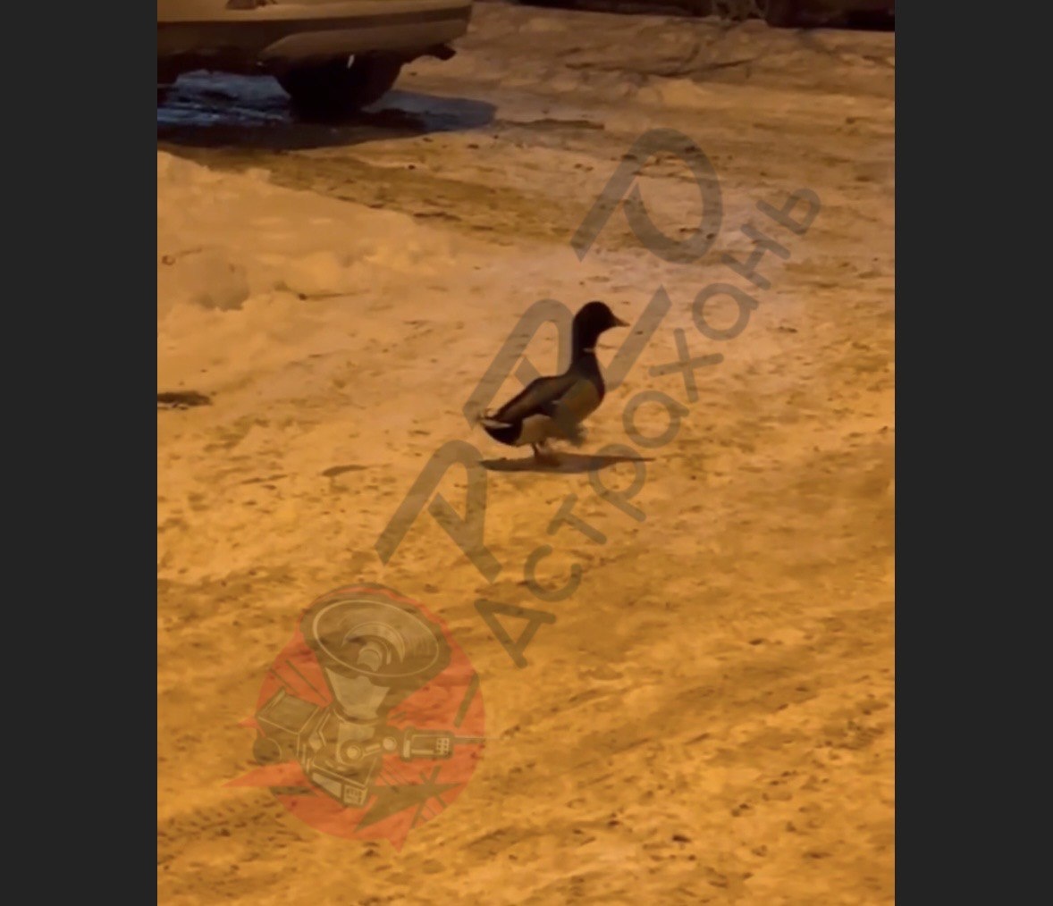 Селезень вышел с проверкой: утка «проинспектировала» уборку снега во дворах Астрахани