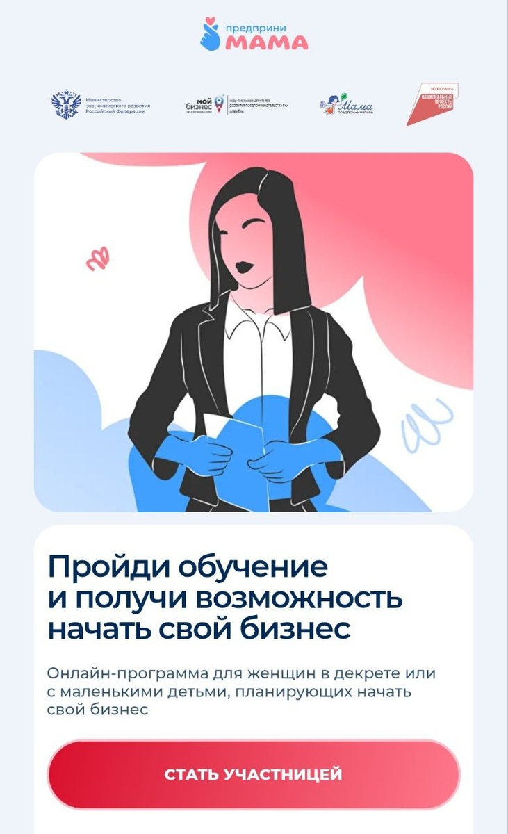 Наткнулась вот на такую программу от Минэкономразвития и Авито. Это курс по основам предпринимательства для мам, он онлайн,сформированная бизнес-идея не обязательна! Думаю, что мамам, у которых есть ресурс, будет интересно. Регистрация открыта до 20/02. https://предпринимама.рф/