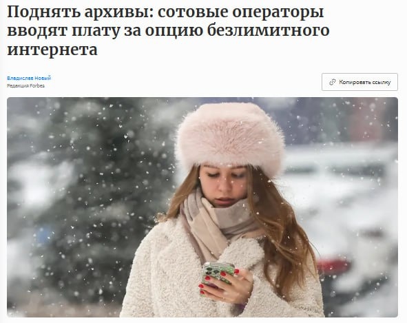 Безлимитный интернет теперь считается дополнительной услугой, а не частью тарифа. Как сообщает Forbes, с 1 января Мегафон начал списывать 25–99 рублей в месяц для части абонентов, Билайн — 4,5 рубля в сутки. При этом отказ от оплаты означает переход на ограниченный пакет трафика без возможности вернуть безлимит. 👉 Подписаться | Прислать новость | Чат
