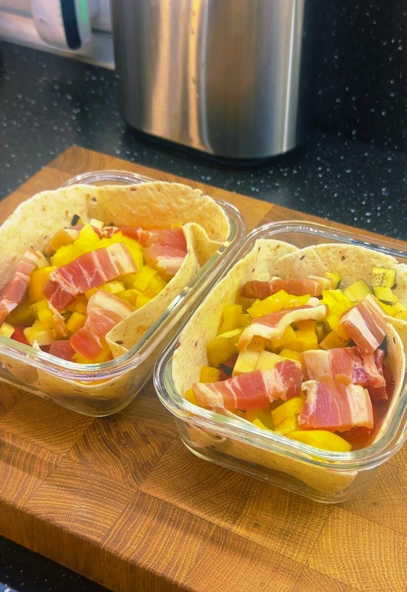 Продолжаем наш марафон полезных завтраков. Быстро, сытно и вкусно. Ингредиенты: 🫓 Лепешка злаковая - 50 г 🥚 Яйца - 2 шт 🍅 Томаты - 45–50 г 🥒 Кабачок - 25 г 🍆 Баклажан - 25 г 🫑 Перец - 25 г 🥓 Бекон - 30 г 🧀 Моцарелла - 30 г Приготовление: 1️⃣ Яйца, овощи и бекон выложить на лепешку, посолить и поперчить. 2️⃣ Перемешать. 3️⃣ В духовку на 180° на 20 минут. 4️⃣ Достать, добавить моцареллу и ещё на пару минут в духовку 🔥 Готово! Отличный завтрак для бодрого старта дня 💛