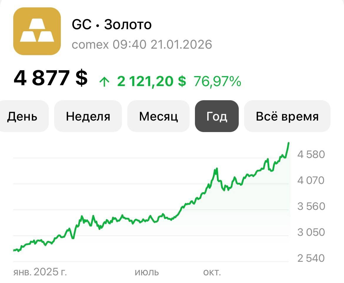 ⚡️ Золото приближается к отметке в 4,9 тысячи долларов за унцию. За последний год стоимость драгоценного металла выросла на 77%.