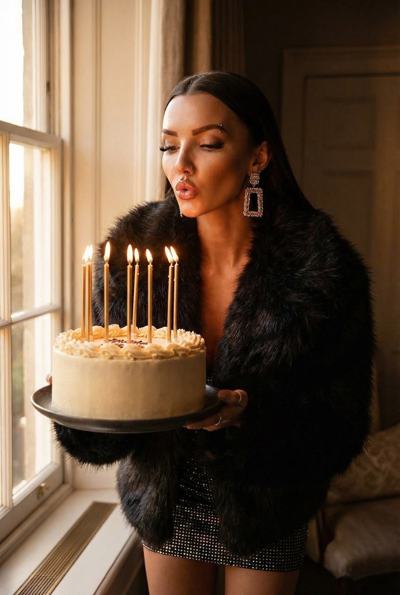 🤩🤩🤩🤩🤩🤩 возьми лицо с предоставленного фотореференса и максимально сохрани все его черты при генерации изображения. Праздничный кадр в интерьере, девушка стоит в комнате возле большого окна, теплый мягкий свет падает сбоку. Она держит в руках торт с длинными горящими свечами, губы сложены трубочкой, будто загадывает желание и собирается задувать свечи. Крупные блестящие серьги в виде прямоугольников, кожа сияющая, гламурный вечерний макияж с акцентом на губы. На ней объемная пушистая шуба с длинным ворсом, под ней короткое блестящее платье, виднеющееся снизу. Атмосфера роскошного дня рождения, уютный богатый свет, легкий эффект свечения вокруг торта, стильная кинематографичная съемка в полутени. 🤩🤩🤩🤩🤩🤩🤩