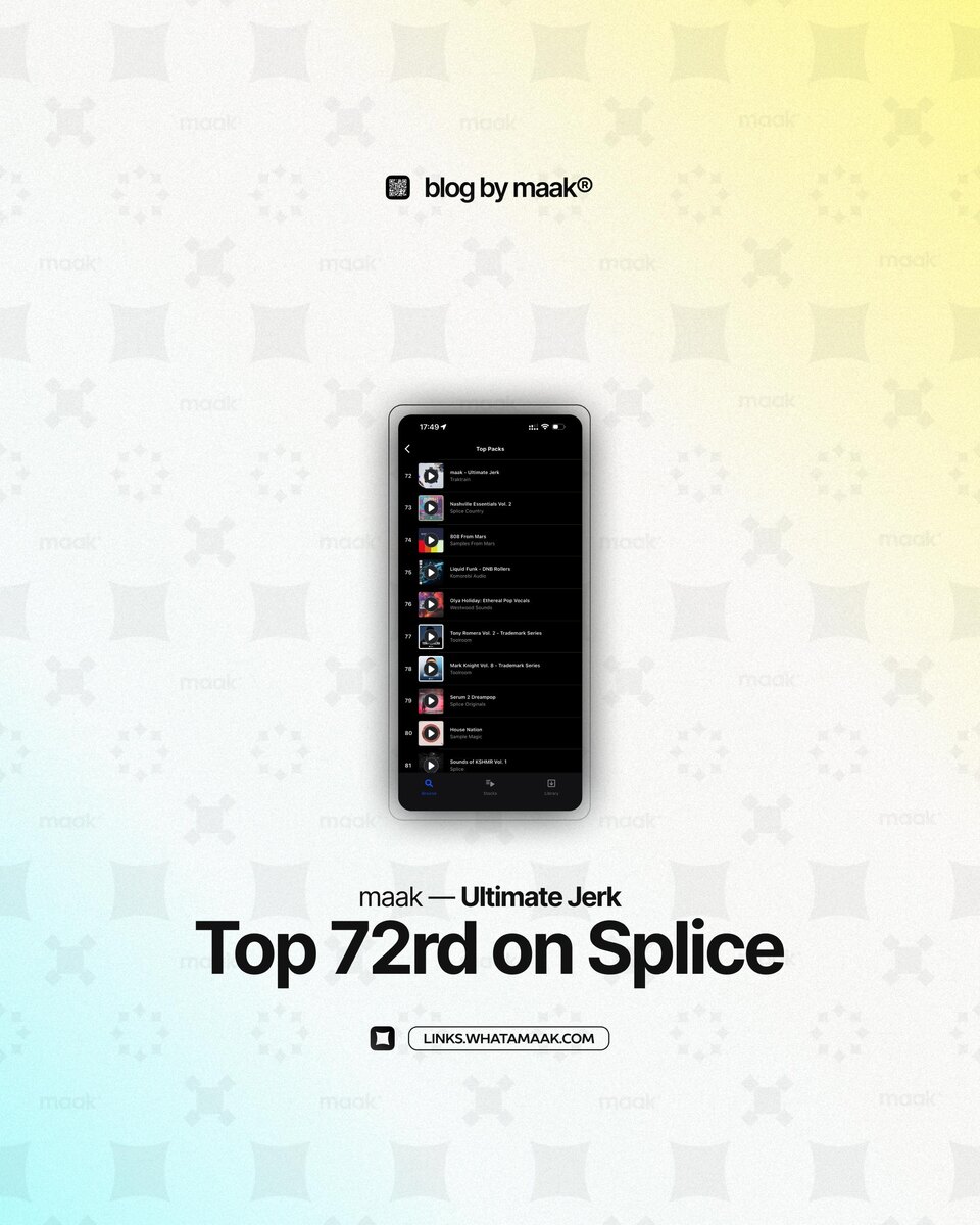 ! Наш недавний релиз семпл-пака «Ultimate Jerk» недавно успел ворваться в топ-100 Splice и поднялся на 72-ую строчку. Летим ещё выше! ⭐️ ℹ️ #splice #чарт 🔗 maak® × подробнее • ⚡️ boost