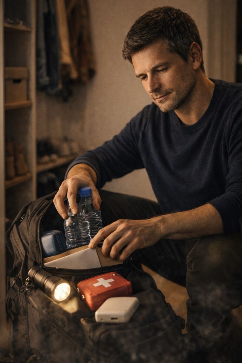 Вода, еда, фонарь, радио/зарядки, аптечка, базовая гигиена, наличные, копии документов. Это стандартная логика гражданской готовности.