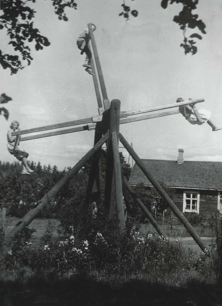 На этом снимке 1951 года запечатлены необычные деревенские качели в Финляндии, устроенные в форме небольшой мельницы. Такие конструкции служили одновременно развлечением и местом сбора жителей, особенно детей, привнося радость и живость в сельскую повседневность послевоенного времени.