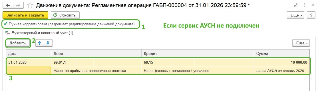 В 1С Бухгалтерия предприятия в помощнике Закрытие месяца (Операции – закрытие месяца) в 4 разделе есть регламентная операция Начисление налога АУСН ✍Если сервис 1С АУСН не подключен, то пользователю необходимо вручную начислить налог в этой операции.️ Для этого нажмите Показать проводки, установите галку "Ручная корректировка" и по кнопке Добавить создайте проводку Дт 99.01.1 Кт 68.15 по начислению налога за отчетный месяц, укажите сумму по данным ФНС. 🧾 Записать и закрыть. 📘Более подробно в нашей инструкции на сайте https://clck.ru/3RNeb8 Желаем вам успешного ведения учета и правильных налоговых начислений! 😊