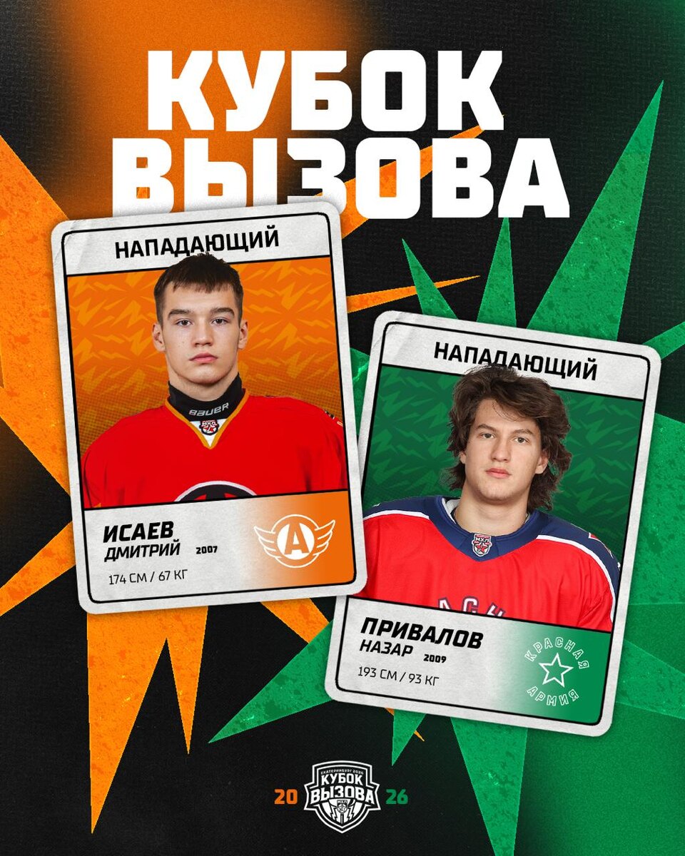 ! Скорее всего это будет лучшая пятница в вашей жизни — 6️⃣ февраля. Только вы, Екатеринбург и лучшие игроки МХЛ. Дмитрий Исаев🚗 — первый снайпер «Авто». За 26 матчей текущего чемпионата он набрал 38 очков в идеальной пропорции 19/19 — почти полтора очка за матч. Игрок провел под сотню матчей к 18 годам, заработав 92 (45+47) результативных балла. У молодого форварда отличный показатель полезности — «+24». Юркий левый нападающий с хлестким броском — отличное усиление для команды Востока. Назар Привалов🪖 — его уже называют самым громким открытием сезона. Мощнейший (193/93) нападающий 2009 года с двух ног ворвался в МХЛ, захватив все статистические топы, где могут быть форварды. За 34 матча в дебютном сезоне он успел набрать 38 (25+13) очков, быстрее всех оформить два голевых хет-трика, один ассистентский и стать первым снайпером лиги среди игроков 2009 года. На площадке ему лучше не попадаться – 115 силовых, второе место по победным голам (7 удачных бросков, фартовый!), полезность «