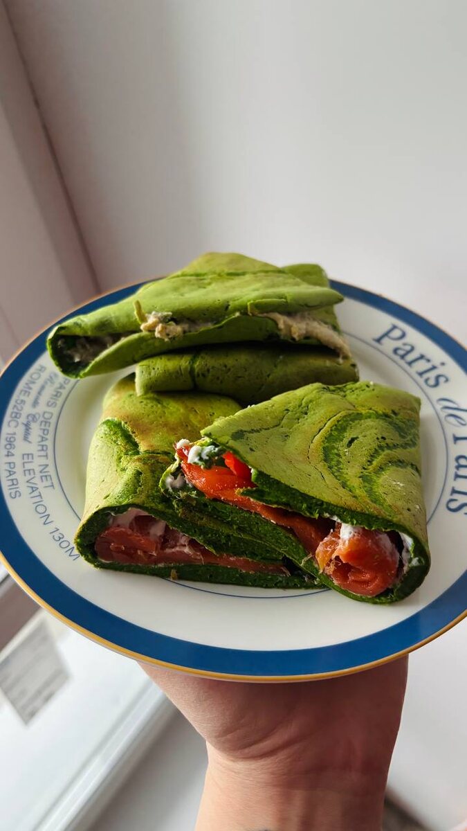 ! нам понадобится пачка шпината (у меня была 75 грамм), яйцо, около 60-65 грамм муки и столовая ложка сметаны или греческого йогурта. соль и специи по вкусу: я взяла соль и молотый черный перец, классика. шпинат нужно блендернуть, опционально сказать йоптвоюмать у меня же есть замороженный, и дальше смешать с остальными ингредиентами до однородности. должно получиться густое ярко-зеленое тесто. про замороженный шпинат — я в принципе порицаю жарку и прочие издевательства над свежей зеленью, заморозка дешевле + проще в приготовлении. просто разморозьте (хоть в микроволновке) зелень и действуйте по той же схеме. обещаю завтра принести апдейт на эту тему! вываливайте тесто на сухую разогретую сковороду (огонь чуть выше среднего) и жарьте по 2-3 минуты с каждой стороны. я сделала толстые лепёшки: вышло 2 штуки диаметром 20 см, прожарились быстро. в одну я запихала творожный сыр и копченую рыбку, во вторую — т.н. тунцовый замес, ща и им поделюсь 👇🏻 банка тунца в собственном соку, 100