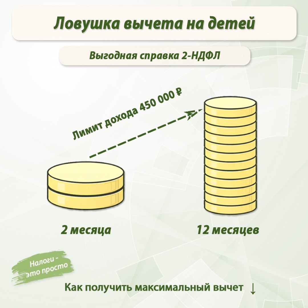 Потеряли 13 000 ₽. 💁♀️ В комментариях спросили: "Наталья, что значит выгодная справка?" Объясняю. 📌 Детские вычеты можно заявить только у одного работодателя. Если у вас несколько мест работы (основная, подработка, совместительство), нужно выбирать ту справку 2-НДФЛ, где ежемесячный доход меньше. Почему так? Вычеты на детей предоставляются ежемесячно, но только, пока доход с начала года не превысит 450 000 ₽. Расчет идет по каждому работодателю отдельно! Превысили — всё, вычет до конца года больше не положен. 🤷♀️ 👩🏻🦰 Пример: У Ольги трое детей и два места работы. На основной - ежемесячный доход составляет 200 000 ₽, на другой - 30 000 ₽. 🔵На основной работе стандартный вычет будет предоставляться 2 месяца, далее лимит 450 000 ₽ будет превышен. 🔵Зато на второй работе - до этого лимита не дойдем, вычет положен 12 месяцев: 12 * 30 000 ₽ = 360 000 ₽. Что по деньгам? Ежемесячный вычет на троих детей составляет 10 200 ₽ = 1400 + 2800 + 6000 Если заявляем вычет: 🔵на основ