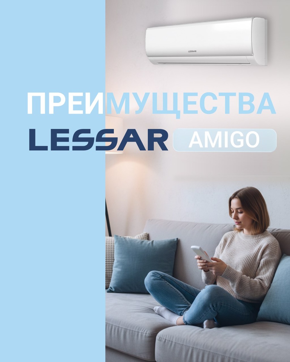🔝 LESSAR AMIGO — это оптимальное решение для ценителей энергоэффективных технологий в классическом дизайне. Внутренние блоки AMIGO имеют минимальный уровень шума 22 дБ: их работа не слышна для окружающих, что позволяет разместить их в любом жилом помещении. Мы подготовили понятные карточки, которые вы можете отправлять заказчикам, или публиковать в своих соц. сетях 📲 🌐 Заказать LESSAR AMIGO можно на сайте klimatprof.online