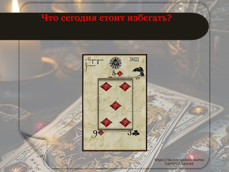 Результат гадания на картах: Что сегодня стоит избегать? Вам выпала карта: 5 БУБЕЙ (Пятёрка Денариев) Ответ: Карта 5 Бубей — это прямое указание на зону риска. Сегодня стоит быть особенно осторожным и избегать ситуаций, связанных с материальными потерями, финансовой нестабильностью, чувством нужды и нездоровой конкуренцией. Конкретные рекомендации, чего сегодня стоит избегать: 1. Крупных трат и финансовых рисков. Не совершайте импульсивных дорогих покупок, не давайте и не берите деньги в долг, не участвуйте в сомнительных финансовых авантюрах или азартных играх. Высок риск «выбросить деньги на ветер». 2. Обсуждения денег в негативном ключе. Избегайте разговоров о бедности, кризисе, долгах, а также жалоб на нехватку средств. Это может притянуть и усилить именно эту энергию. 3. Сравнения себя с другими в материальном плане. Не заглядывайтесь на чужое «богатство» и не испытывайте чувства ущербности из-за своего финансового положения. Сегодня это приведёт только к упадку сил и зависти. 4.