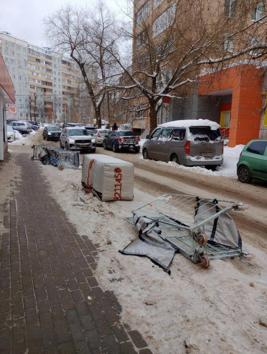 Магазин на углу улиц Калинина и Свердлова занял общественные парковочные места, перегородив их сломанными контейнерами и другим имуществом.