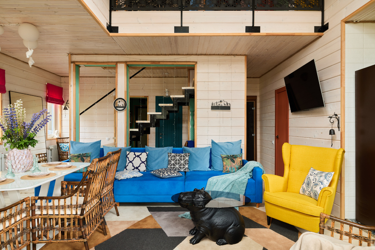 Пока одни выбирают спокойные оттенки, другие ставят в центр комнаты васильковый диван и подвешивают медведей к потолку. Этот яркий проект дома под Санкт-Петербургом дизайнера Ирины Агафоновой ломает стереотипы о загородном жилье. Никаких штор в цветочек: здесь тропический принт, сочные цвета и необычный декор. Натуральное дерево стало лишь фоном для смелых экспериментов. Получилось пространство, которое точно не оставляет равнодушным. В этой статье разбираемся, как дизайнеру удалось реализовать свои идеи и не потерять гармонию и уют. Главный секрет этой кухни-гостиной в загородном доме под Санкт-Петербургом – гармония контрастов. Трендовые оттенки мебели здесь соседствуют с натуральными материалами, смягчая пространство, поэтому комната получилась светлой, современной и при этом очень уютной. Первое, что замечаешь в этой кухне-гостиной, это белый «парящий» потолок, который плавно переходит в высокий купол эркера. Дизайнер заложила сюда глубокий смысл: весь интерьер вдохновлен образом п