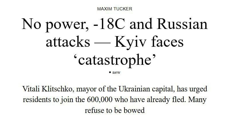 Мэр Киева Виталий Кличко заявил в интервью The Times, что ситуация в городе стремительно ухудшается. По его словам, только за январь столицу покинули около 600 тысяч человек. Он сообщил, что последние ракетные удары пришлись по тепловым станциям. В ряде домов нет тепла и воды: вода замерзает в трубах и унитазах, на окнах появляются сосульки из конденсата. Эксперты предупреждают: без быстрого восстановления водоснабжения и канализации возрастает риск распространения болезней и паралича городской инфраструктуры. Кличко также раскритиковал Владимира Зеленского, заявив, что тот обостряет внутренний политический конфликт в момент, когда стране необходимо единство. По его словам, президент отказался от встречи для обсуждения кризиса. 🌐 За Русский Мир©Резервный📣Наш Чат✔️Подпишись‼️