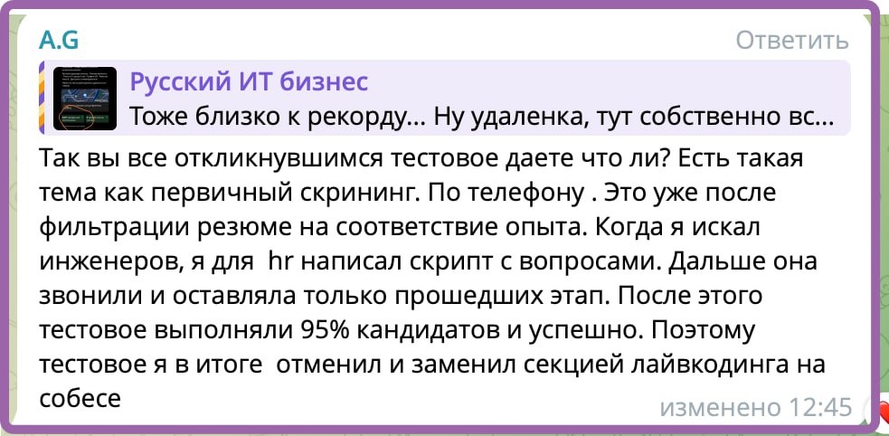 Без первичного скоринга. Я понимаю, что сейчас получу ушат помоев на голову, но поясню логику - на ХХ есть фильтрация (город, возраст, гражданство и т.п.). Если соискатель прошел этот фильтр, а мы имеем, условно, 600 откликов после оного, то дальше мы просто тупо всех просим сделать тестовое авто-ответом. Не читая резюме. У нас нет HR - мендежера, а утонуть в оценке легче легкого. Я понимаю, что подход звучит как зверский, пишу как есть, но знаю из опыта - делают тестовое около 5% и дальше уже вполне себе можно работать с выборкой 20-30 человек. Русский ИТ бизнес