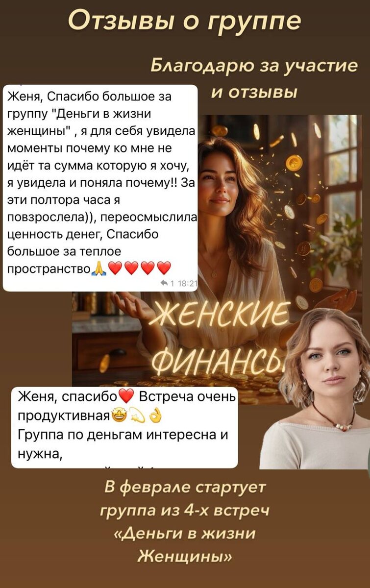 🌟 Осознания, взросление, пересборка отношений с деньгами - всё это про внутренние сценарии и разрешение себе большего. В начале февраля стартует краткосрочная терапевтическая группа «Деньги в жизни женщины». Будем глубже исследовать бессознательные финансовые сценарии и нейтрализовать блоки на пути к желаемой финансовой цели 🎯 Информация в ЛС @psychologist_Nutritionist Больше отзывов в комментариях 👇