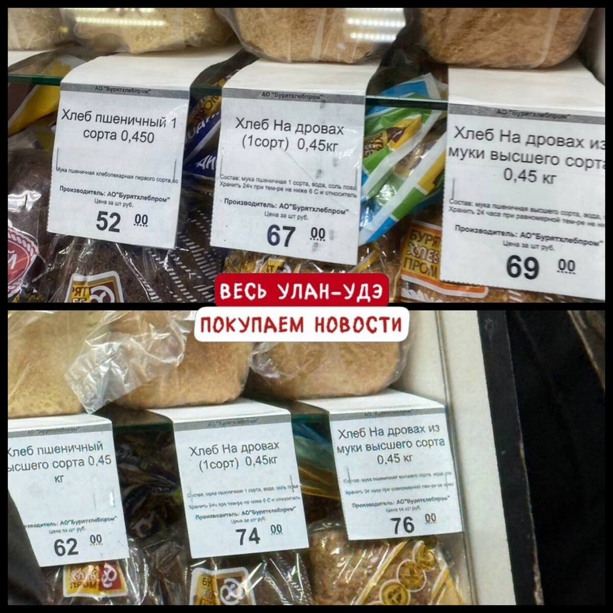 Пшеничный хлеб подорожал на 10 рублей в Улан-Удэ в торговых торговых точках «Бурятхлебппома», сообщает паблик «Весь Улан-Удэ». Теперь 450-граммовая булка из муки первого сорта стоит 62 рубля. В среднем хлеб по всем позициям подорожал на 5 рублей. По данным Бурятстата на 12 января, 1 кг пшеничного хлеба в среднем стоит уже 130 рублей 59 копеек, ржаного — 113 рублей 52 копейки. В январе 2025 года 1 кг белого хлеба стоил в Улан-Удэ в среднем 117,78 рубля, серого — 106,17 рубля. Таким образом, даже по официальным данным, хлеб за год подорожал почти на 11%. И это без учёта последнего повышения цен, начавшегося после праздников. Подписаться| Прислать новость| Помочь бустами