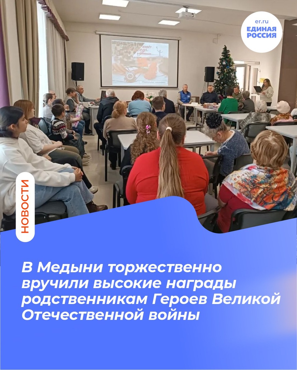 В мероприятии, прошедшем в центральной районной библиотеке, принял участие председатель общественного совета партийного проекта «Историческая память» партии «Единая Россия», депутат Законодательного Собрания Олег Комиссар. С приветственным словом выступил Секретарь местного отделения партии «Единая Россия», глава Медынского округа Николай Козлов. Олег Комиссар вручил высокие награды близким родственникам Героев, подчеркнув важность сохранения памяти и семейного воспитания на примере подвигов. Он также сообщил, что работа по поиску потомков ветеранов будет продолжена. Николай Козлов отметил присутствие на встрече молодёжи, подчеркнув важность знания истории, следования заветам старшего поколения и личного вклада в развитие страны. Он назвал такие мероприятия ключевыми для сохранения живой памяти поколений и воспитания патриотизма. 💙ВК|📝ДЗЕН