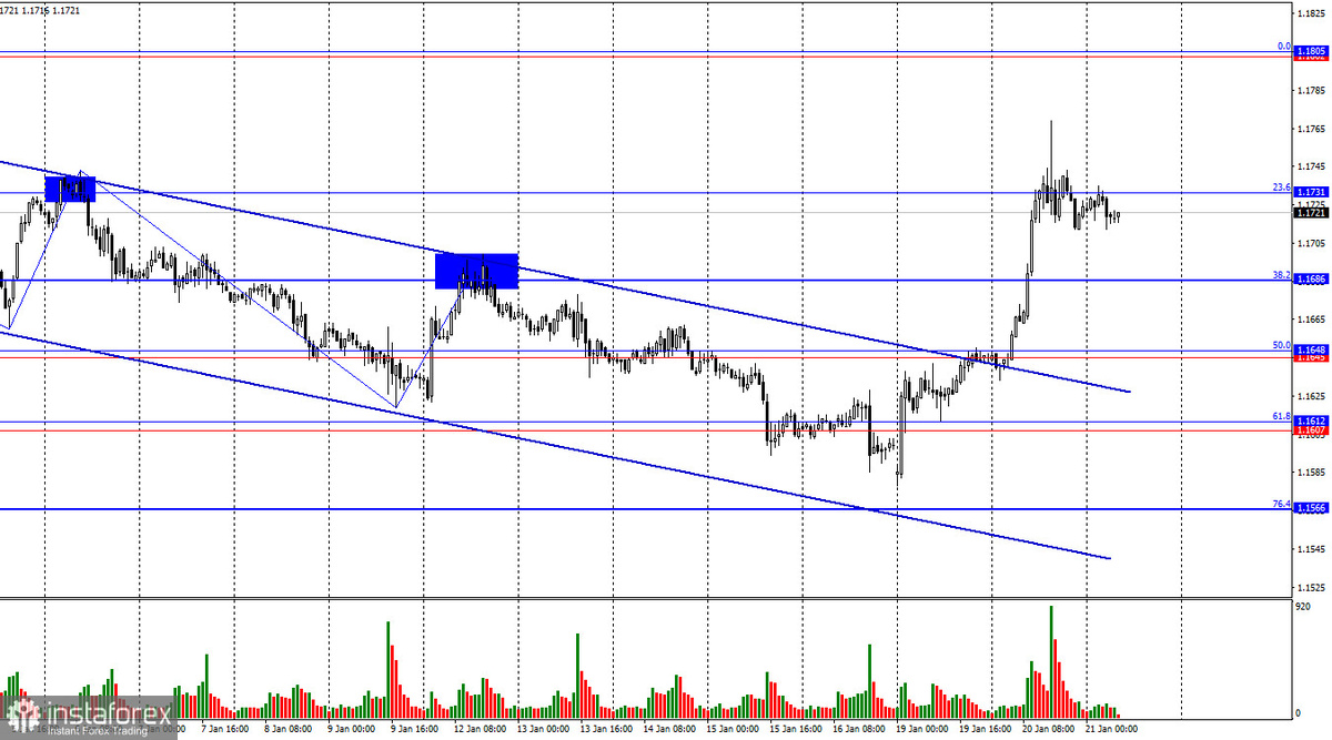 Пара EUR/USD во вторник продолжала процесс роста и достигла к концу дня уровень коррекции 23,6% – 1,1731. Отбой котировок от этого уровня сработает в пользу американского доллара и некоторого падения в направлении уровней Фибо 38,2% и 50,0%. Закрепление курса пары над уровнем 1,1731 повысит вероятность продолжения роста в направлении зоны сопротивления 1,1802–1,1805. Ситуация с волнами на часовом графике остается простой. Последняя завершенная волна вниз пробила лоу предыдущей волны, а новая волна вверх пробила предыдущий пик. Таким образом, тренд вновь поменялся на «бычий». Быки переходят в новое наступление, которого без Дональда Трампа могло бы и не случится. Однако Трамп продолжает накалять обстановку вокруг Гренландии, а рынки реагируют бегством от опасной американской валюты с неопределенными экономическими перспективами. Во вторник трейдеры продолжали отыгрывать события выходных и понедельника. Напомню, что Дональд Трамп объявил о введении новых торговых пошлин для некоторых стр
