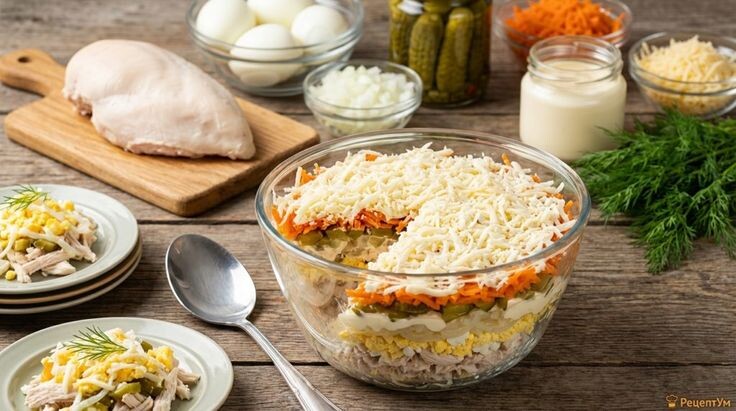 Скажу честно: этот салат — одна из тех вещей, которые хочется готовить снова и снова. Он не требует сложных продуктов и долгой готовки, а результат всегда впечатляет. В нём идеально сочетаются сочная курица, пикантная морковь по-корейски, мягкие грибы и сырная нежность. И именно поэтому он так часто становится хитом на семейных столах.