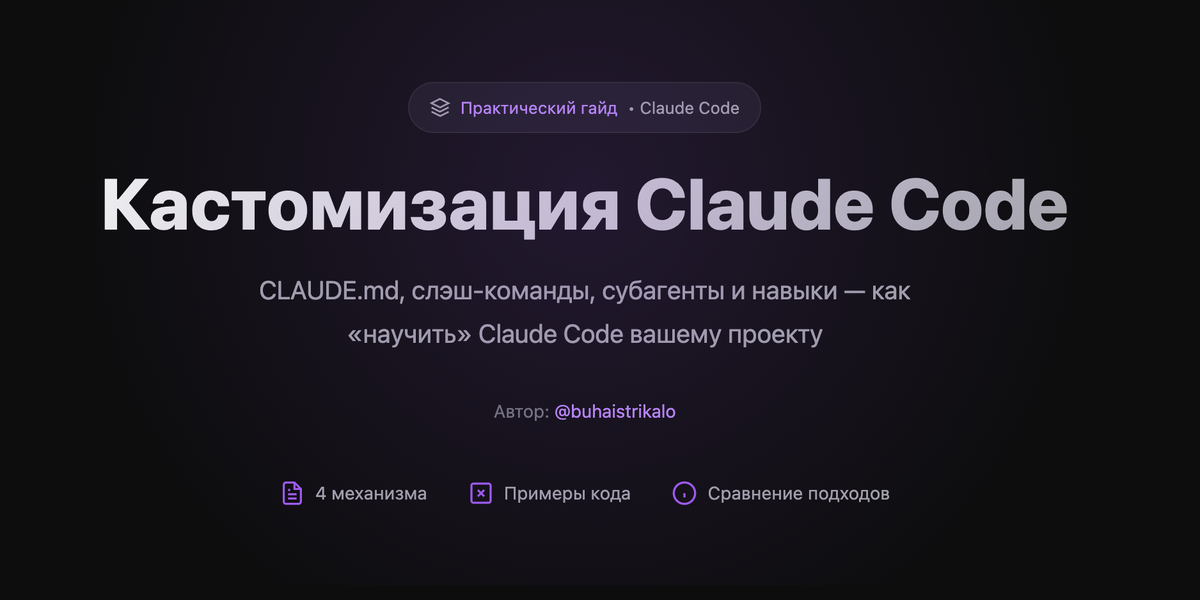 В Claude Code четыре механизма кастомизации. Документация разбросана, примеры оторваны от жизни. Долго не мог понять, зачем столько способов, если все вроде про одно. Разобрался. Claude Code не знает твой проект. Версии библиотек, конвенции команды, где лежит документация - ничего. Генерит устаревший код, игнорирует ваши правила, каждый раз с нуля. CLAUDE.md - файл, который грузится при запуске. Память проекта: правила, конвенции, ссылки. В длинных сессиях хранние инструкции иногда теряются - это минус. Слэш-команды - сохранённые промпты, вызываешь через /имя. Макросы, по сути. Загрузить доки, прогнать чеклист, сгенерить по шаблону - для этого. Субагенты - изолированный контекст. Claude отправляет задачу, получает сжатый результат. Основной контекст не забивается. Когда надо много читать и анализировать - то, что нужно. Skills - воркфлоу, которые Claude находит сам по описанию задачи. Несколько файлов: документация, скрипты, шаблоны. - Правила на постоянку → CLAUDE.md - Повторяемый вор