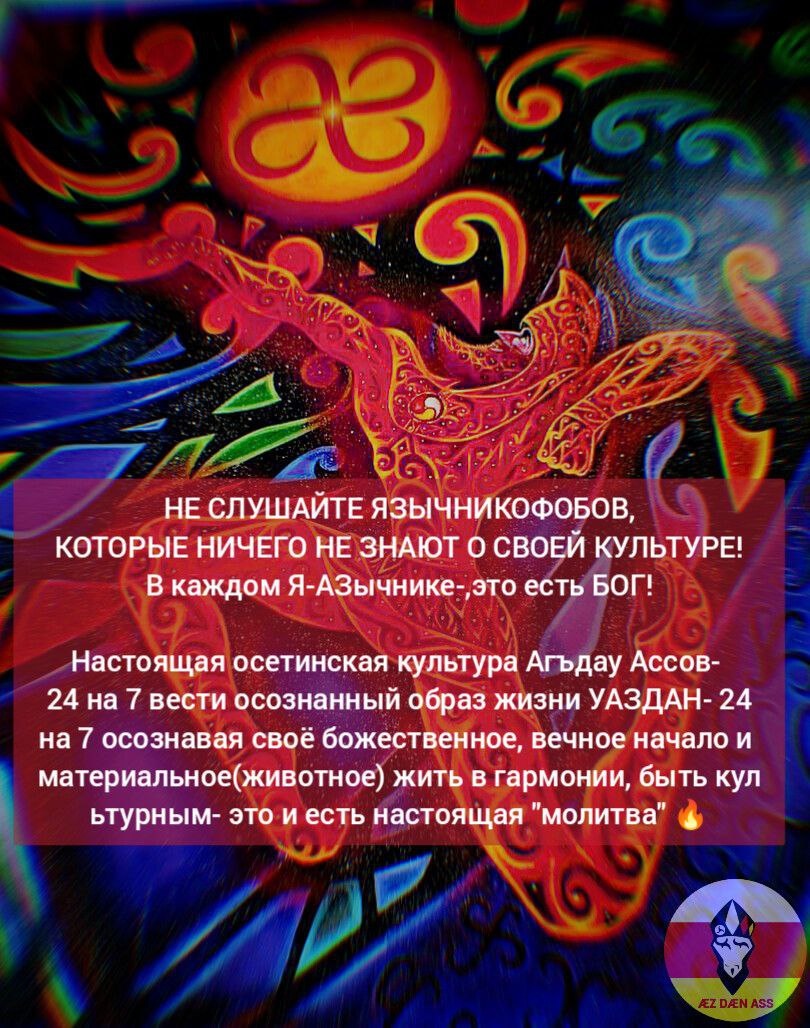 , КОТОРЫЕ НИЧЕГО НЕ ЗНАЮТ О СВОЕЙ КУЛЬТУРЕ! В каждом Я-АЗычнике-,это есть БОГ! Настоящая осетинская культура Агъдау Ассов- 24 на 7 вести осознанный образ жизни УАЗДАН- 24 на 7 осознавая своё божественное, вечное начало и материальное(животное) жить в гармонии, быть культурным- это и есть настоящая "молитва" 🔥