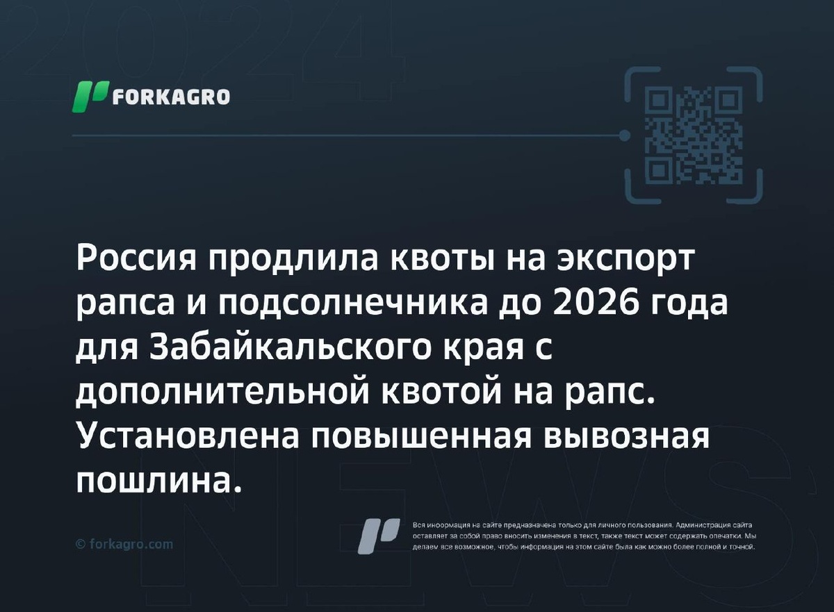 Установлена повышенная вывозная пошлина. Правительство России продлило квоты на экспорт рапса и подсолнечника из Забайкальского края до 31 августа 2026 года. Дополнительная квота на рапс составит 18,8 тыс. тонн. С 1 сентября 2024 года снят запрет на экспорт рапса с введением вывозной пошлины в размере 30%. Объем урожая рапса в России в 2025 году достиг рекордных 5,6 млн тонн, что на 0,9 млн тонн больше, чем в 2024 году. Перейти к источнику