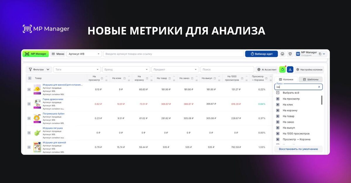 В рекламной аналитике MP Manager появились новые метрики формата «На» – ещё один шаг к более точному пониманию эффективности рекламы. Чтобы было наглядно: 🔹 Метрики «За» Показывают, сколько вы потратили на одно действие: – за клик – за заказ – за просмотр 🔹 Метрики «На» (новые) Показывают, сколько вы заработали на одно действие: – сколько суммы заказов пришлось на 1 клик – на 1 просмотр – на 1 заказ Фактически: «За» – про расходы «На» – про отдачу 💡 Для чего это нужно: чтобы сразу видеть, какие клики приносят выручку, быстро сравнивать ключи и кампании по деньгам, а не ощущениям, и оперативно отключать неэффективные сегменты. Колонки можно включить в таблице через «⚙️» Перейти в сервис → Анализируйте рекламу не только с позиции «сколько потратили», но и с позиции «что это дало бизнесу». #Реклама #Аналитика