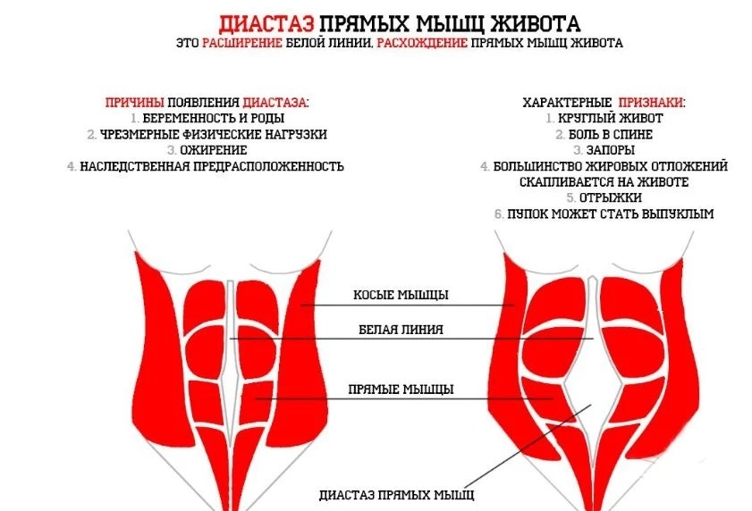 Диастаз — это расхождение прямых мышц живота из-за растяжения белой линии, которое развивается под давлением увеличившегося живота во время беременности.