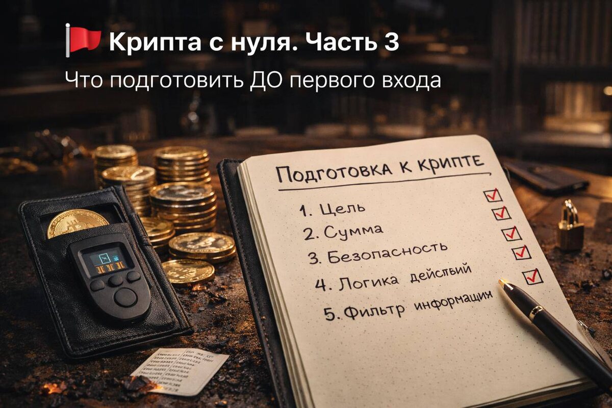 Часть 3 - что подготовить ДО первого входа Перед тем как покупать монеты или заходить в проекты, нужно сделать базовую подготовку. Без этого вход в крипту - это случайность, а не система. Минимальный набор: 1️⃣ Понимание цели Ответь себе честно: ⏩ зачем ты идёшь в крипту ⏩ на какой срок ⏩ с каким уровнем риска ❗️Без цели ты будешь метаться между монетами и идеями. 2️⃣ Сумма, которую не жалко потерять Первый вход - это обучение. Если заходишь на последние деньги - решения будут эмоциональными. 3️⃣ Базовая безопасность До любых покупок: ⏩ кошелёк ⏩ сохранённая seed-фраза ⏩ понимание, где хранить средства ❗️Без этого любые «иксы» не имеют смысла. 4️⃣ Простая логика действий Не стратегия, а схема: ⏩ что я делаю сначала ⏩ что делаю потом ⏩ что НЕ делаю вообще ❗️Новичку важнее ограничения, чем возможности. 5️⃣ Фильтр информации Если ты: ⏩ читаешь всех ⏩ смотришь всё ⏩ реагируешь на каждый пост ❗️Ты не инвестор, ты шумоприёмник. Главное: ❗️ В крипте выигрывает не тот, кто зашёл ра