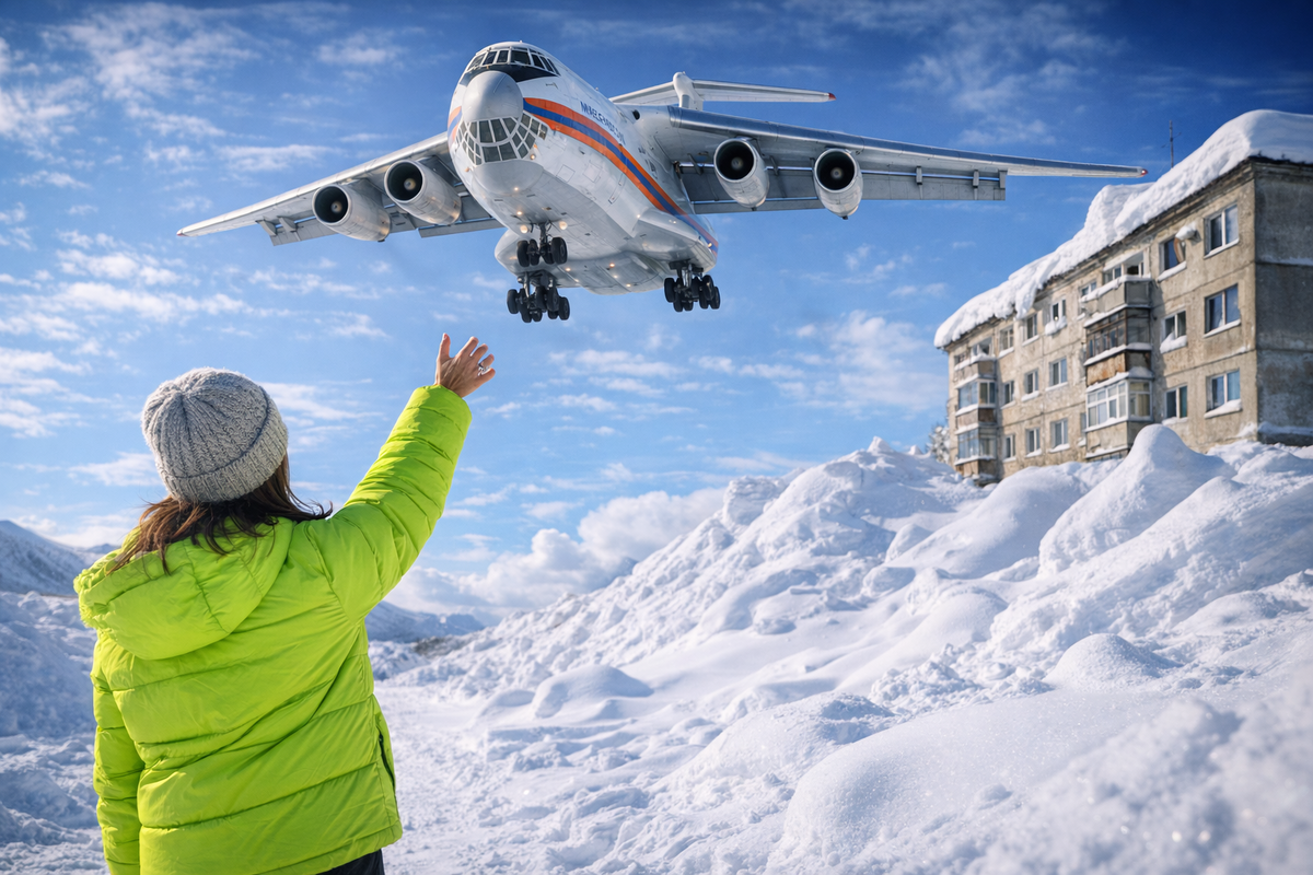 Самолёт Ил-76 грузят снегоуборочными машинами на Сахалине. Два погрузчика, навесное оборудование, следом ещё пять единиц техники. Всё это отправится на Камчатку — туда, где снег валит с декабря, где сугробы по пояс и люди уже месяц пытаются выбраться из домов.