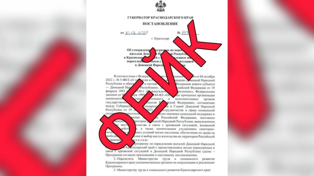 В Краснодарском крае предупредили о распространении ложной информации. В мессенджерах и телеграм-каналах распространяют фальшивое «постановление», якобы подписанное губернатором региона, об утверждении программы по переселению жителей Донецкой Народной Республики. Как сообщили в оперативном штабе края, подобной программы в действительности не существует. Министерство труда и соцразвития Кубани не разрабатывало подобный документ. Более того, в тексте фейка указаны несуществующие органы власти — например, министерство образования, науки и молодежной политики, которое было расформировано еще в 2025 году. Также в крае нет департамента по связям с общественностью и взаимодействию со СМИ. Власти подчеркнули, что в Донецкой Народной Республике не зафиксировано кризисной ситуации, требующей эвакуации граждан. Согласно данным Министерства обороны России, российские войска продолжают занимать более выгодные позиции в донецком направлении. С начала 2026 года освобождены населенные пункты Бондарно