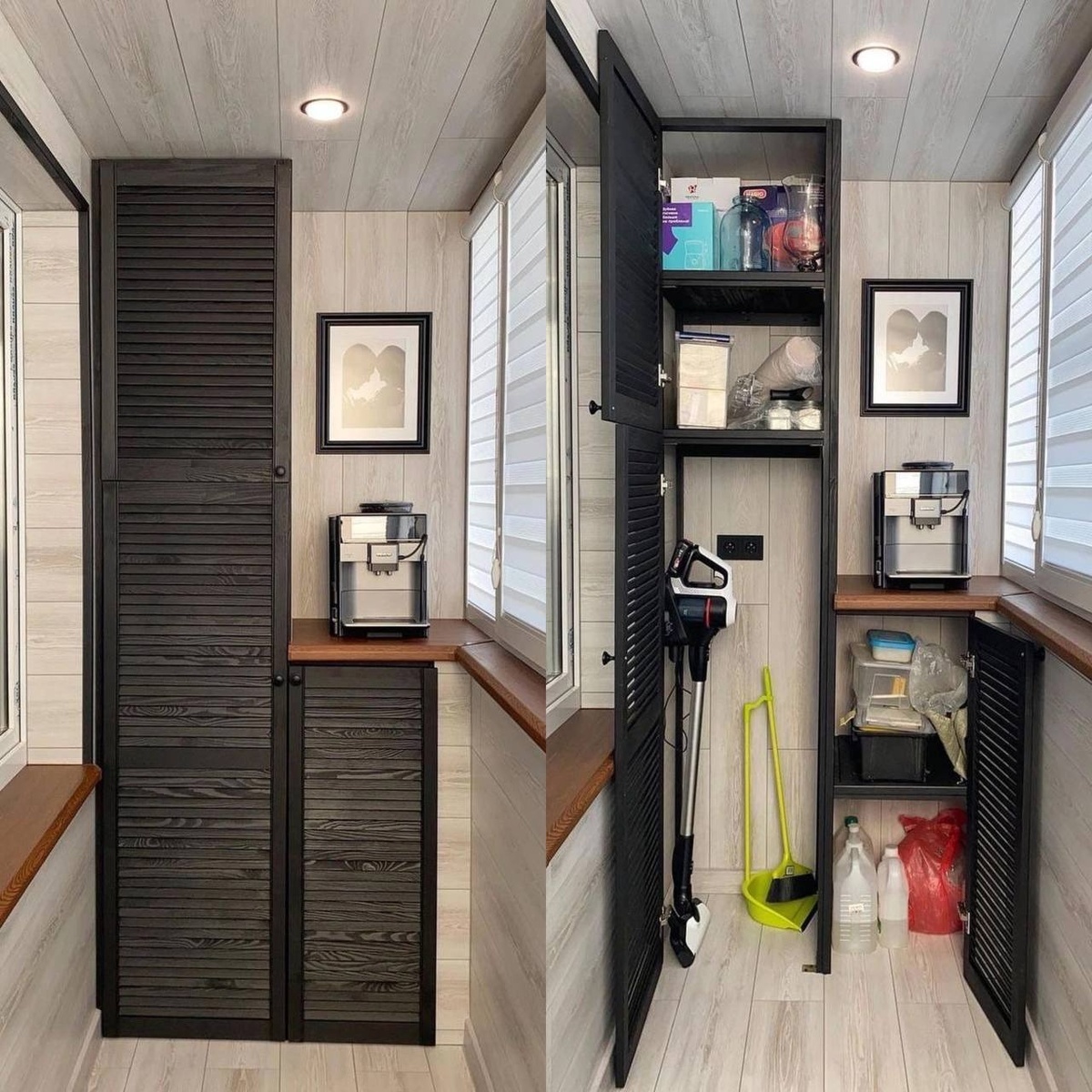 Узкий балкон легко превращается в полноценную кладовку с помощью встроенного шкафа, который использует каждую нишу и сантиметр стены. На примере темного шкафа с ламелями, полками для техники и органайзерами разберем идеи, как сделать систему хранения удобной и стильной без потери места. Встроенная мебель решает главную проблему маленьких лоджий: экономит пространство и адаптируется под любые размеры. Такая кладовка разгружает квартиру и превращает балкон в организованный уголок. На фото шкаф с открытыми дверцами показывает, как ламели сочетаются с практичными решениями для узкого пространства. Ламели не только функциональны, но и добавляют современный акцент без лишних ручек. Полноценная кладовка использует вертикаль, как видно по антресолям и полкам на фото. Верхние зоны превращают шкаф в многоярусный склад с легким доступом к нужному. Нижняя часть шкафа на фото показывает, как организовать то, что всегда под рукой. Нижние секции держат порядок в уборке и быту без лишнего беспорядка.