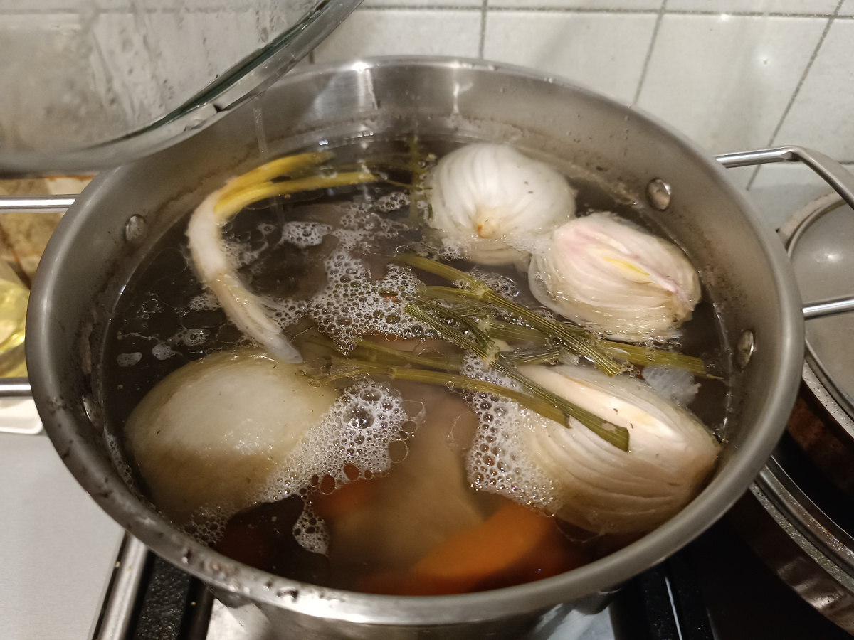 Как раз самое время добавить овощи и специи. Я кладу в обязателтном порядке морковь и лук. Если есть, то ещё стебель сельдерея. Можно добавить лук порей, лавровый лист, перец горошком. Обычно кидаю стебли от петрушки, кинзы и укропа- что есть для аромата.