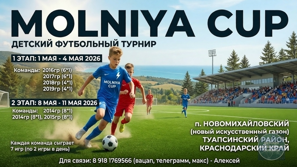”✨ МАЙСКИЕ ПРАЗДНИКИ ⚡ ТУРНИР БУДЕТ ПРОХОДИТЬ В п. НОВОМИХАЙЛОВСКИЙ (новый искусственный газон) , ТУАПСИНСКИЙ РАЙОН, КРАСНОДАРСКИЙ КРАЙ В 2 ЭТАПА: 1 этап💥: (31 апреля день заезда обязательно для всех команд участников ) - игровые дни 1 мая - 4 мая 2026 год играют команды 2016 г р (6*1), 2017 г р (6*1), 2018 г р (4*1), 2019 г р (4*1) ⚽ 2 этап💥: (7 мая день заезда обязательно для всех команд участников) - игровые дни 8 мая - 11 мая 2026 год играют команды 2014 г р (8*1), 2015 г р (8*1)⚽ Каждая команда сыграет на турнире 7 игр (по 2 игры в день)🔝 Вся информация по телефону: 8 918 1769566 (вацап, телеграмм, макс) - Алексей -— #ФутбольныйТурнирМай2026 #ФутбольныйТурнирЮгРоссии2026 #ФутбольныйТурнирКраснодарскийКрай2026 #ФутбольныйТурнирТуапсинскийРайон2026 #ФутбольныйТурнирНовомихайловский2026 #ФутбольныйТурнирКраснодарскийКрай2014гр #ФутбольныйТурнирКраснодарскийКрай2015гр #ФутбольныйТурнирКраснодарскийКрай2016гр #ФутбольныйТурнирКраснодарскийКрай2017гр #ФутбольныйТурнирКраснода