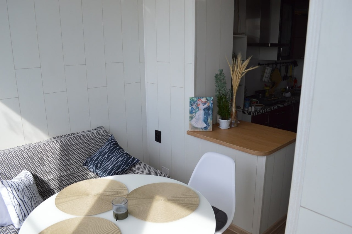 Расширение кухни на балкон: уютная обеденная зона с видом на город