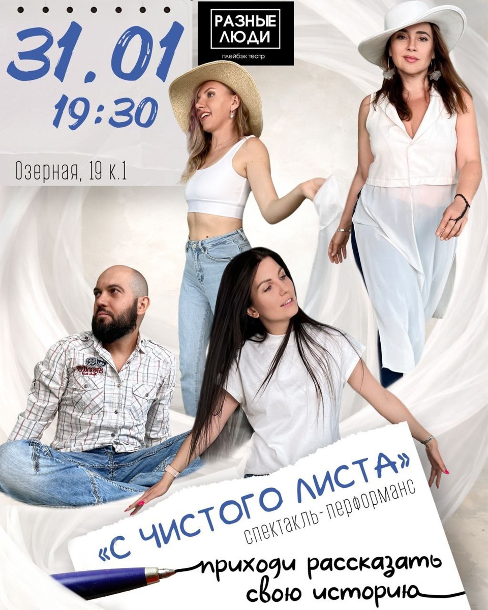 #Краснодар Плейбэк-театр "Разные люди" в перформансе "С чистого лица" Начало в 19:30 Мы привыкли жить по инерции. Та же работа. Те же разговоры. Те же роли. Даже когда внутри уже давно хочется по-другому. Потом наступает момент, когда понимаешь, что дальше так нельзя. Хочется закрыть эту главу жизни и наконец начать новую. А на каком этапе ты сейчас? На паузе? Уже начал что-то новое? Или в раздумьях перед первым шагом? Приглашаем тебя на плейбэк-перформанс «С чистого листа» — вечер историй про начинания и завершения, про смелость отпускать лишнее и выбирать себя. Адрес: Краснодар, ул. Озерная, 19, корпус 1 Билеты: 1500 рублей Регистрация по ссылке #Россия #Перформанс #Разные_люди