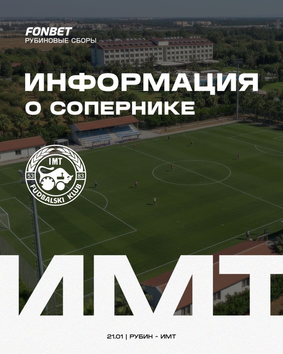 ! Знакомим вас поближе с первым соперником «Рубина» на #FonbetРубиновыхСборах 🔥 «ИМТ» – сербский профессиональный футбольный клуб из города Нови-Београд, основанный в 1953 году. На данный момент клуб выступает в Суперлиге Сербии и идёт на 12-й строчке в турнирной таблице 🇷🇸 Конкурс для наших болельщиков: Пишите в комментариях, с каким счётом закончится матч, кто и на какой минуте забьёт голы. Кто окажется ближе, получит автограф любимого футболиста «Рубина» ✍️ Больше информации в нашей группе, переходите
