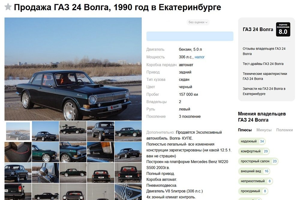 Как выяснила «Российская газета», в Екатеринбурге выставлена на продажу уникальная двухдверная «Волга» ГАЗ-24, да еще с полным приводом и «автоматом». Это не заводской автомобиль, но вполне легальный. И очень дорогой. «Волга» построена на базе Mercedes-Benz S500 (W220). Внешне купе выполнено в стилистике ГАЗ-24, однако вся силовая структура кузова, электроника и техническая начинка остались от Mercedes. Кузовные панели — «волговские», с доработками, окрашены в темно-зеленый металлик. Салон оформлен итальянской натуральной кожей и алькантарой. Техническая база автомобиля полностью соответствует «мерседесовской» платформе: полный привод, автоматическая коробка передач, пневмоподвеска, а также двигатель V8 объемом 5 литров мощностью 306 л.с. В списке оборудования — четырехзонный климат-контроль, круиз-контроль, усилитель руля, электроприводы всех сидений, включая задние, и две фронтальных подушки безопасности. По словам владельца, автомобиль сохранил все системы активной безопасности, кот