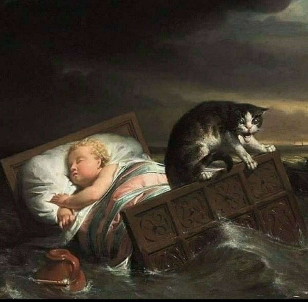 Некрасивый кот, сумасшедший какой-то... Так сначала все и подумали. Но что же здесь происходит? На картине изображена катастрофа - сильное наводнение в Нидерландах в 15 веке, когда погибли тысячи людей. Согласно легенде, после наводнения люди увидели плывущую по волнам колыбель с младенцем. Когда колыбель приблизилась к берегу, на ней заметили кота, который, как безумный, прыгал с одного угла кроватки на другой. Всем было понятно, что ребенок не мог выжить, но обезумевшего кота пожалели и решили спасти. Каково же было всеобщее удивление, когда люди обнаружили младенца мирно спящим! Коту удавалось своими прыжками сохранять равновесие колыбели, и она не перевернулась, даже постель ребенка оказалась сухой. Вот такой удивительный кот жил когда-то. Картина "Наводнение в Бисбосе в 1421 году" написана в 1856 г., художник Лоуренс Альма-Тадема