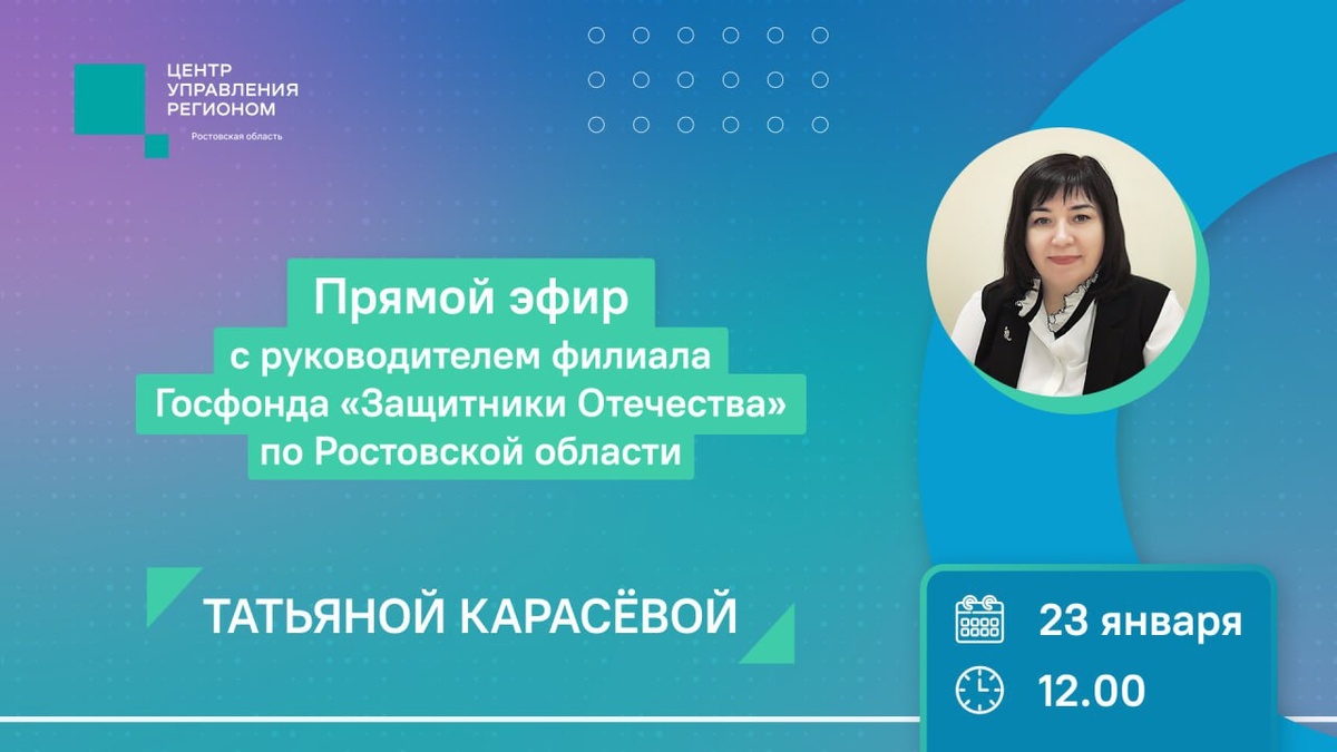 ➡️Два с половиной года в Ростовской области работает филиал Госфонда «Защитники Отечества». Какую помощь оказывают бойцам, какие уникальные проекты реализуют и как подопечные фонда помогают делать регион лучше? На все эти вопросы ответит руководитель филиала Госфонда «Защитники Отечества» по Ростовской области Татьяна Карасёва. 🔈Подключайтесь к прямой трансляции 23 января в 12:00 в паблике ЦУР Ростовской области Вконтакте. 📲О том, что вас интересует, спрашивайте в комментариях. #прямыеэфиры #цур61 #цуринфо #ЦУРРостовскойобласти #Ростовскаяобласть